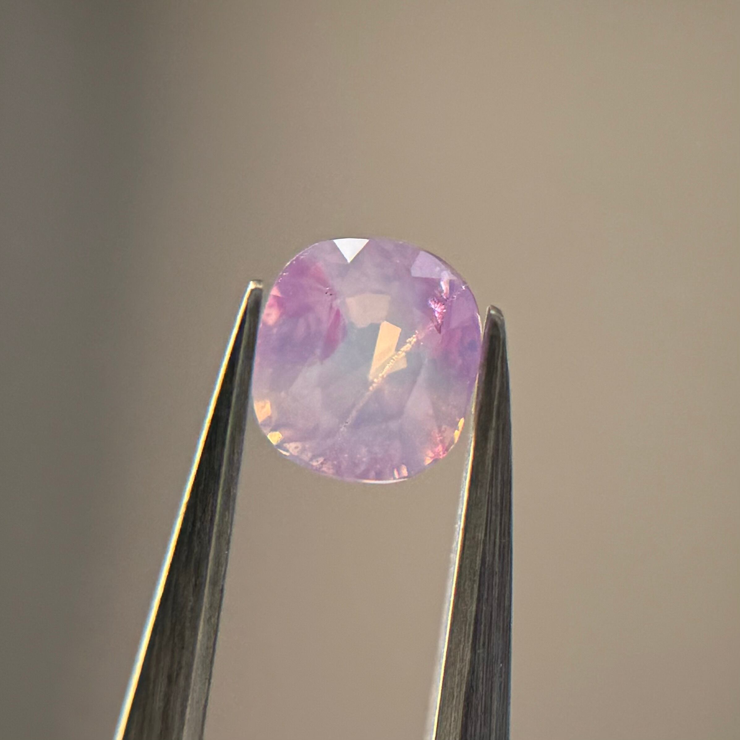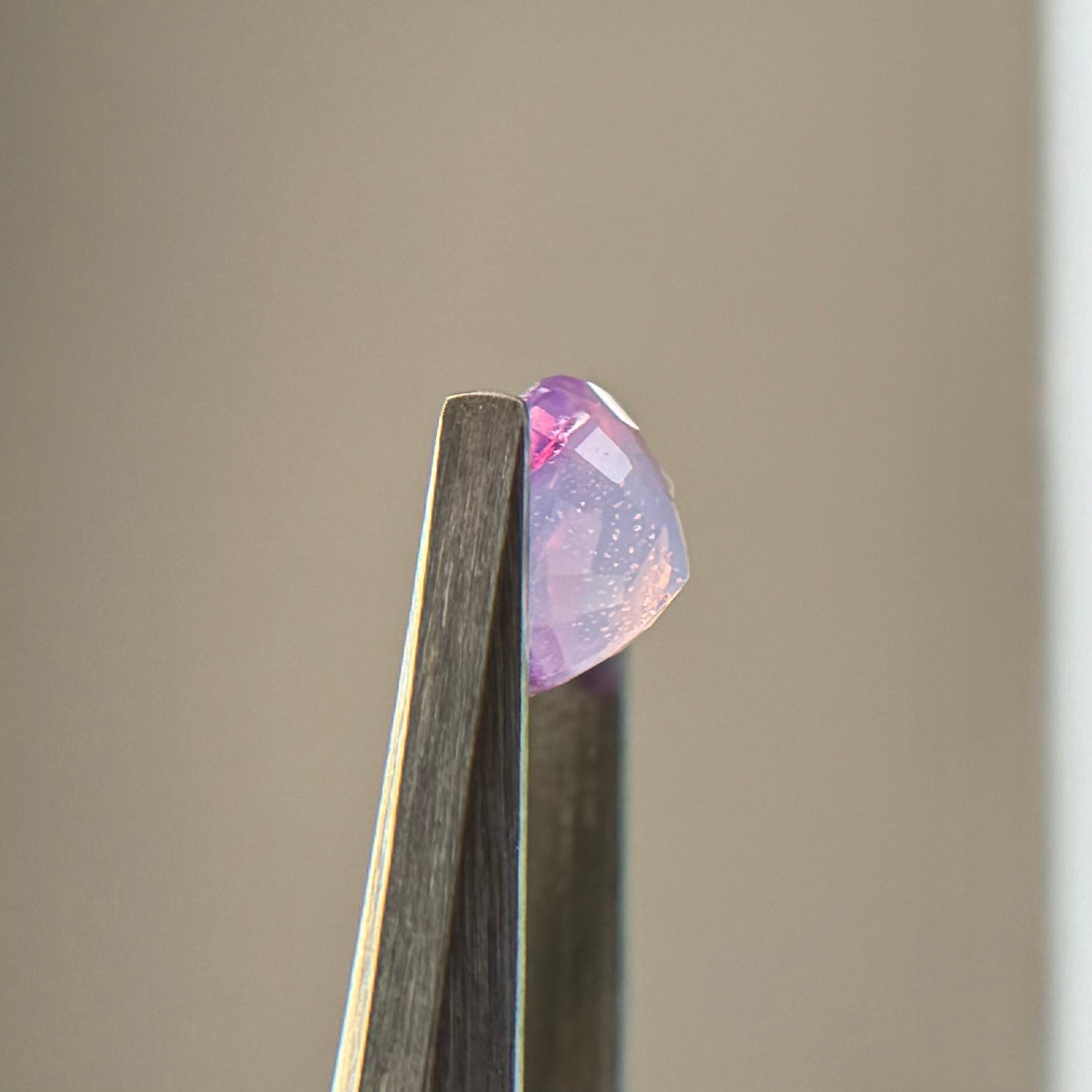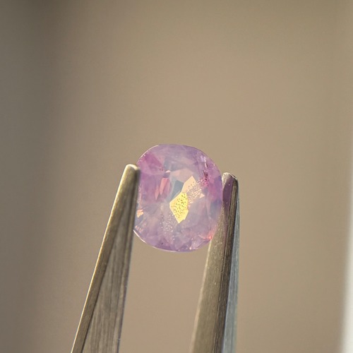 複数箇所に入った色だまりのおかげで角度によってベースの色がコロコロ変わる不思議なシルキーサファイアです。中にある液体インクルージョンにテリが反射し、天の川のように見えるときがあります(指乗せ写真参照)