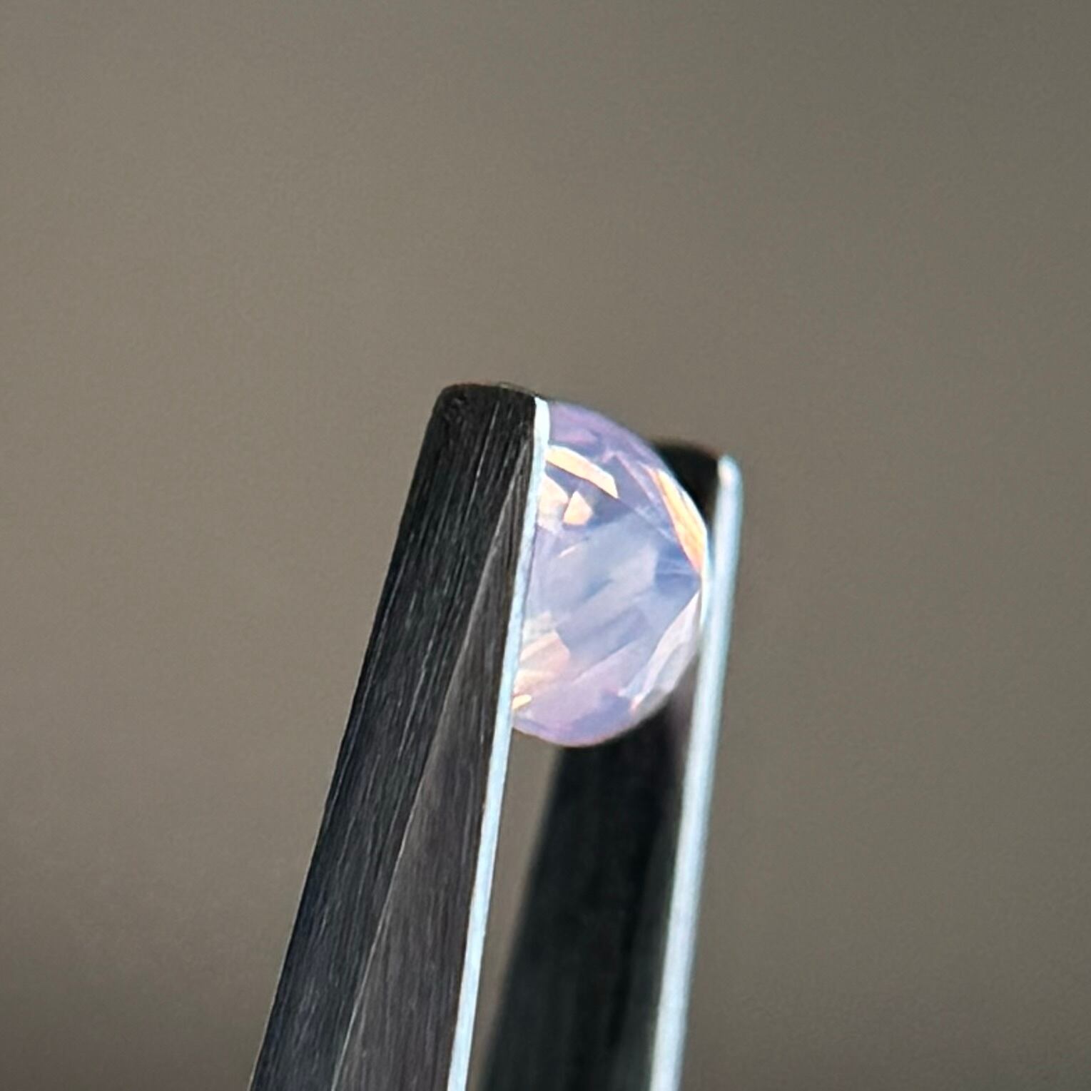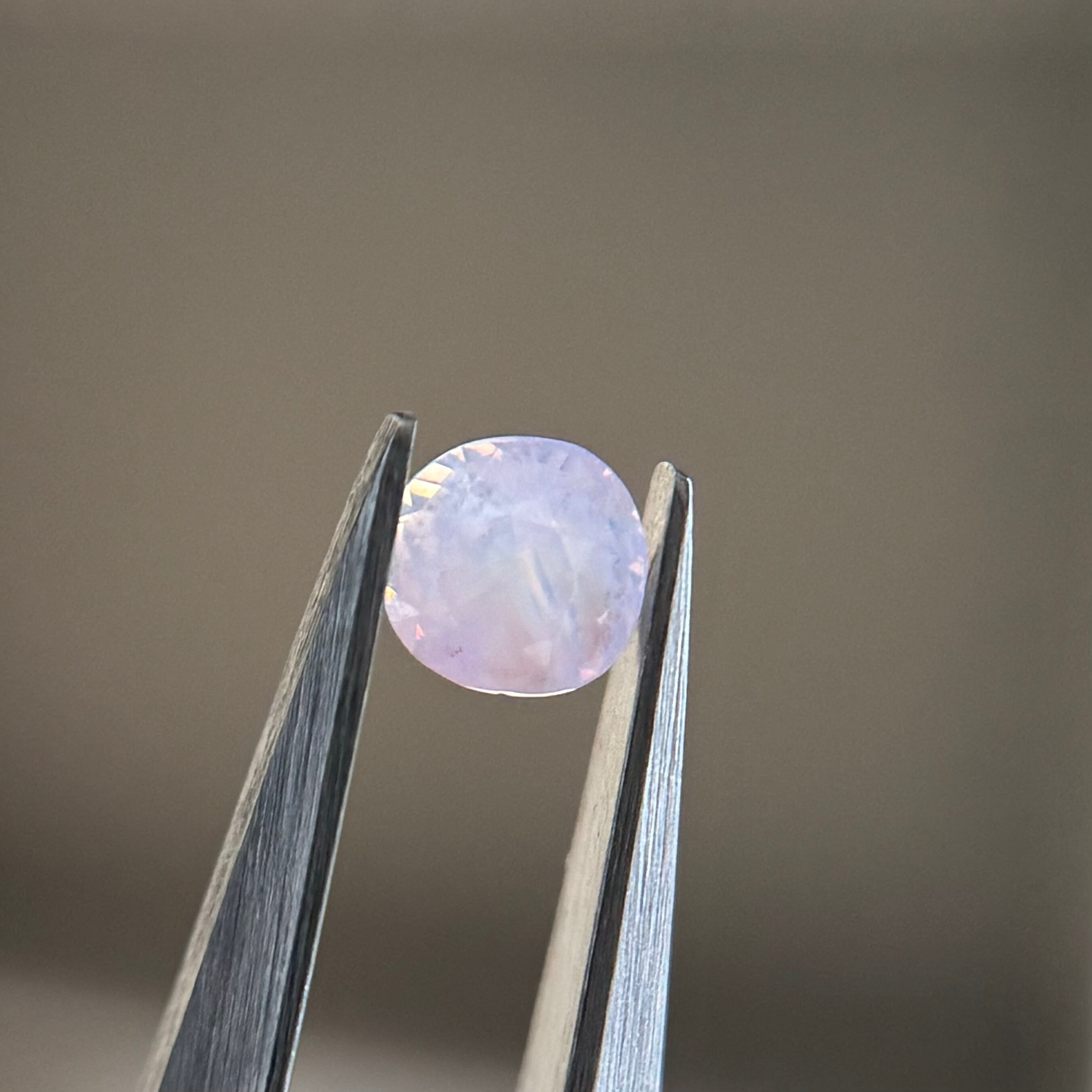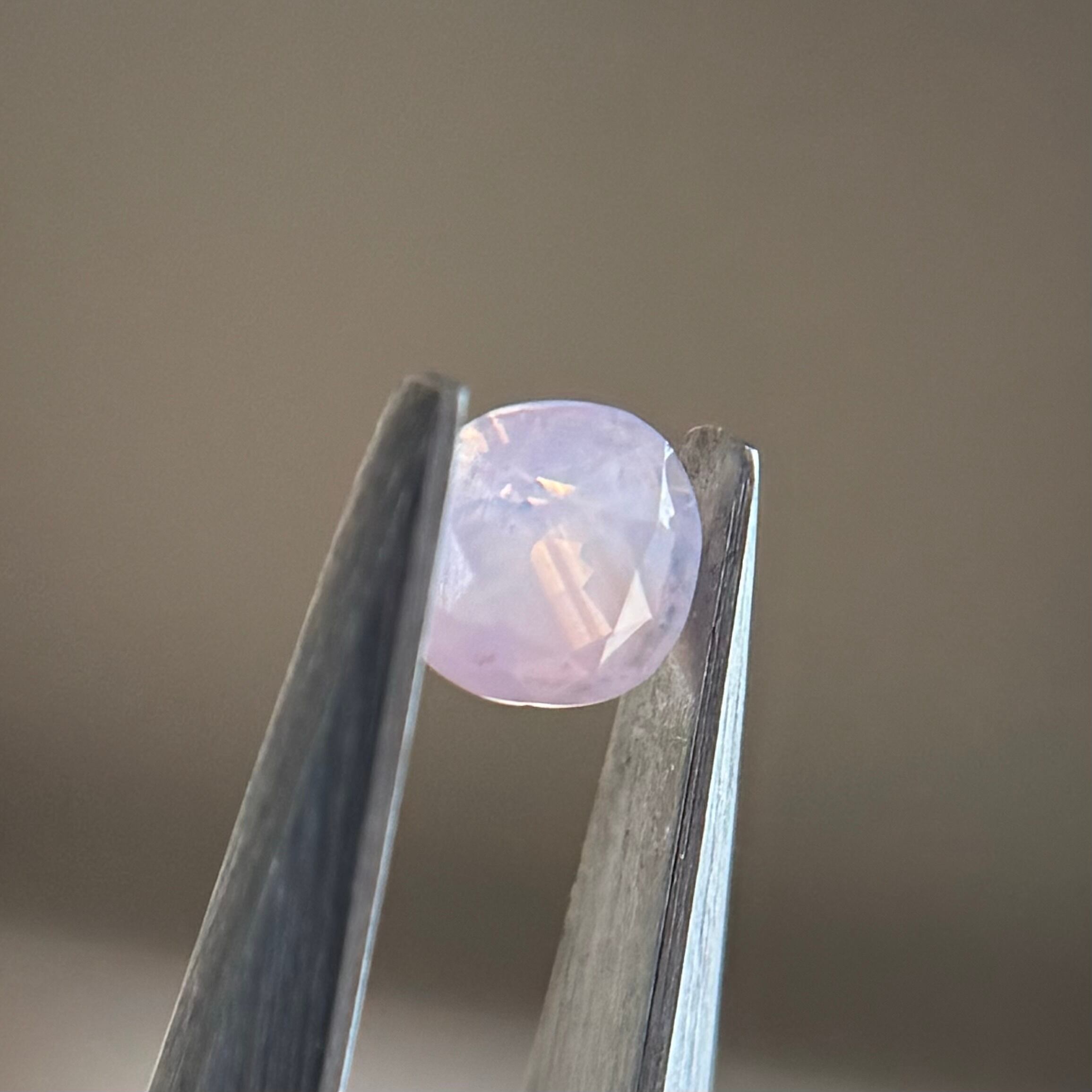 色だまりとピンクに近いオレンジのテリで、まるでいちごミルクキャンディのような色合いのシルキーサファイアです。カットが甘いのも飴ちゃん感があって良いです。ガードルにある黒インクルージョンは爪で隠れる程度で気にならないです