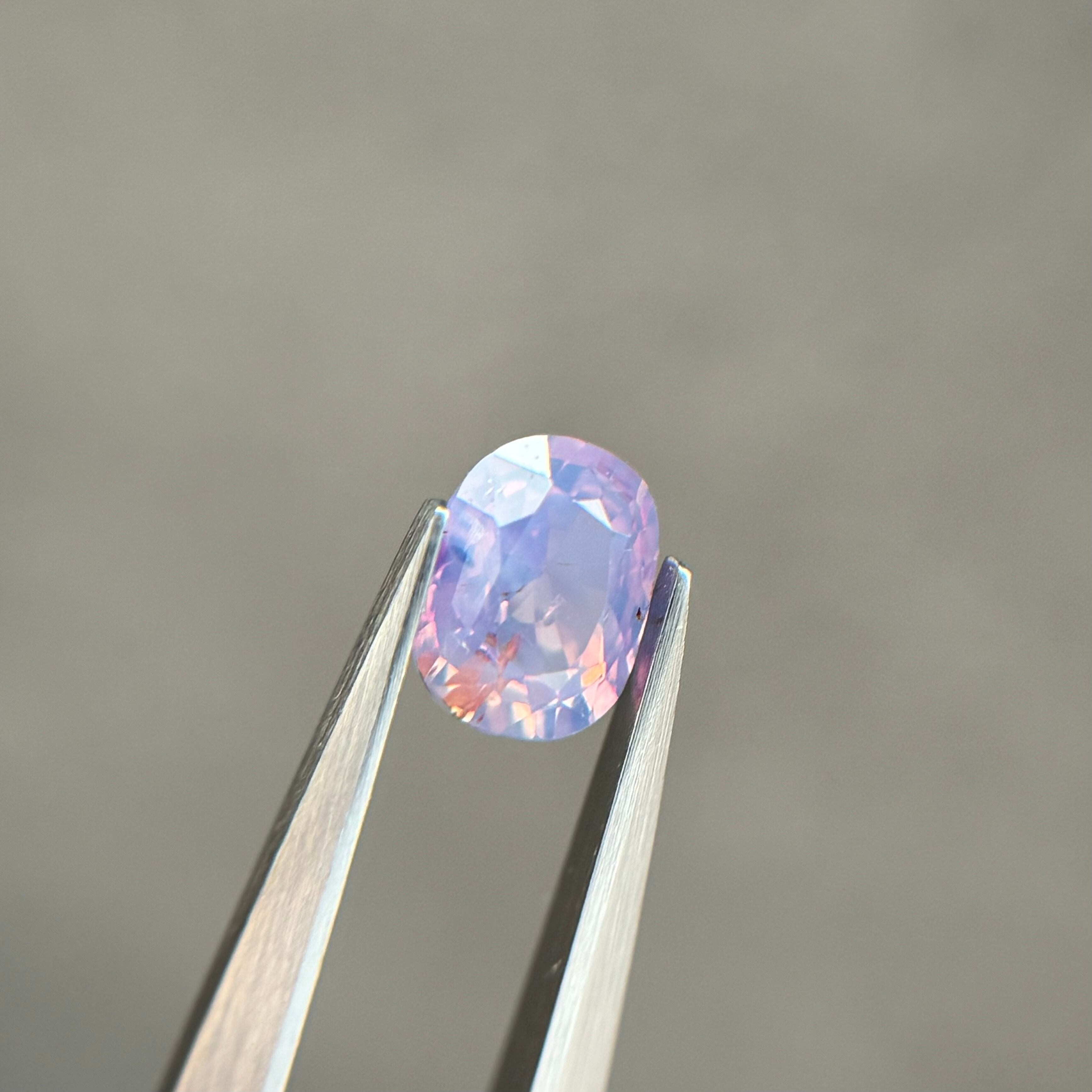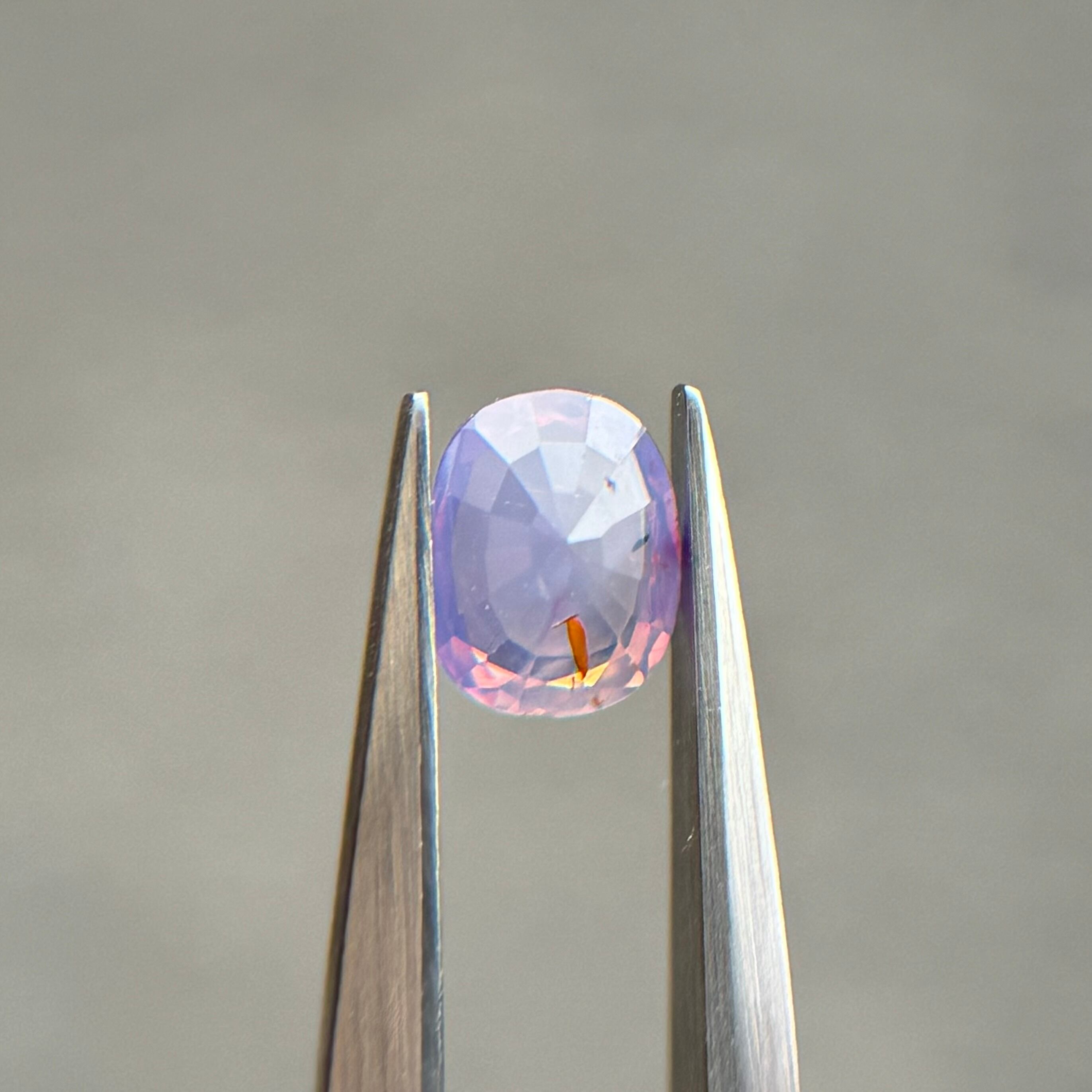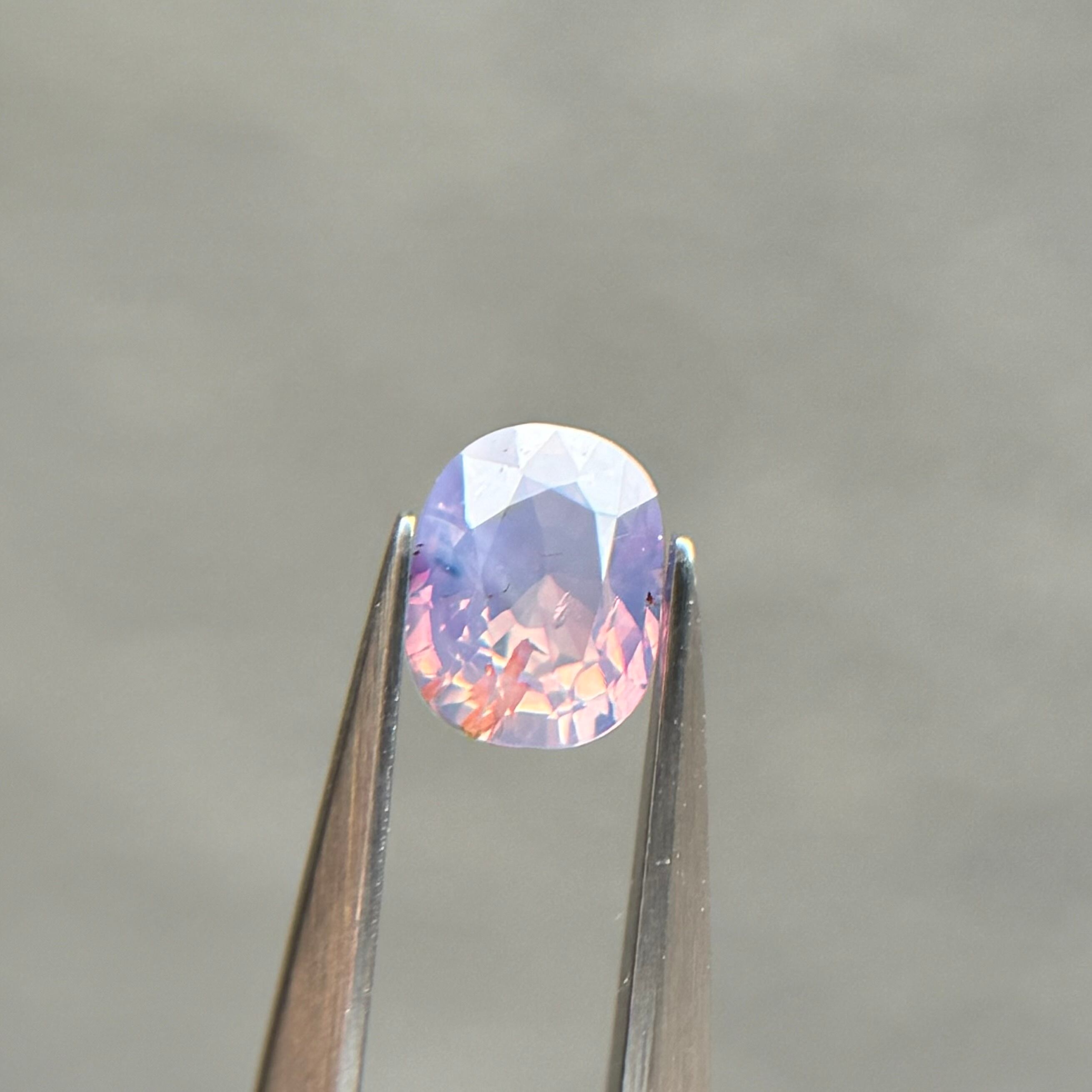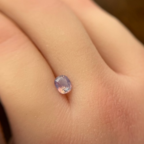 複数のインクルージョンに複数色のテリが反射し、なんだかカラースプレーで落書きしたかのようなシルキーサファイアです。テーブル側に目立つキズなど