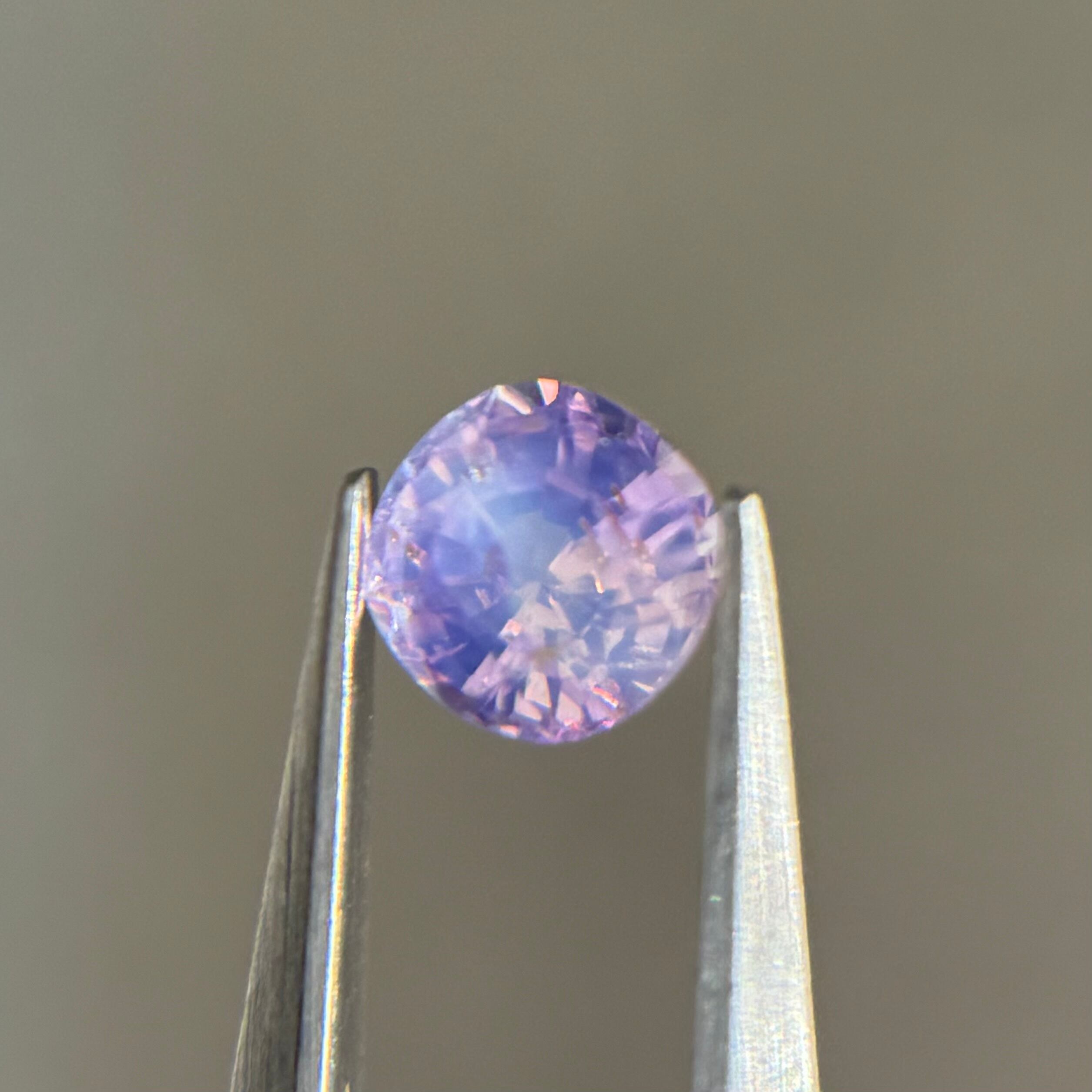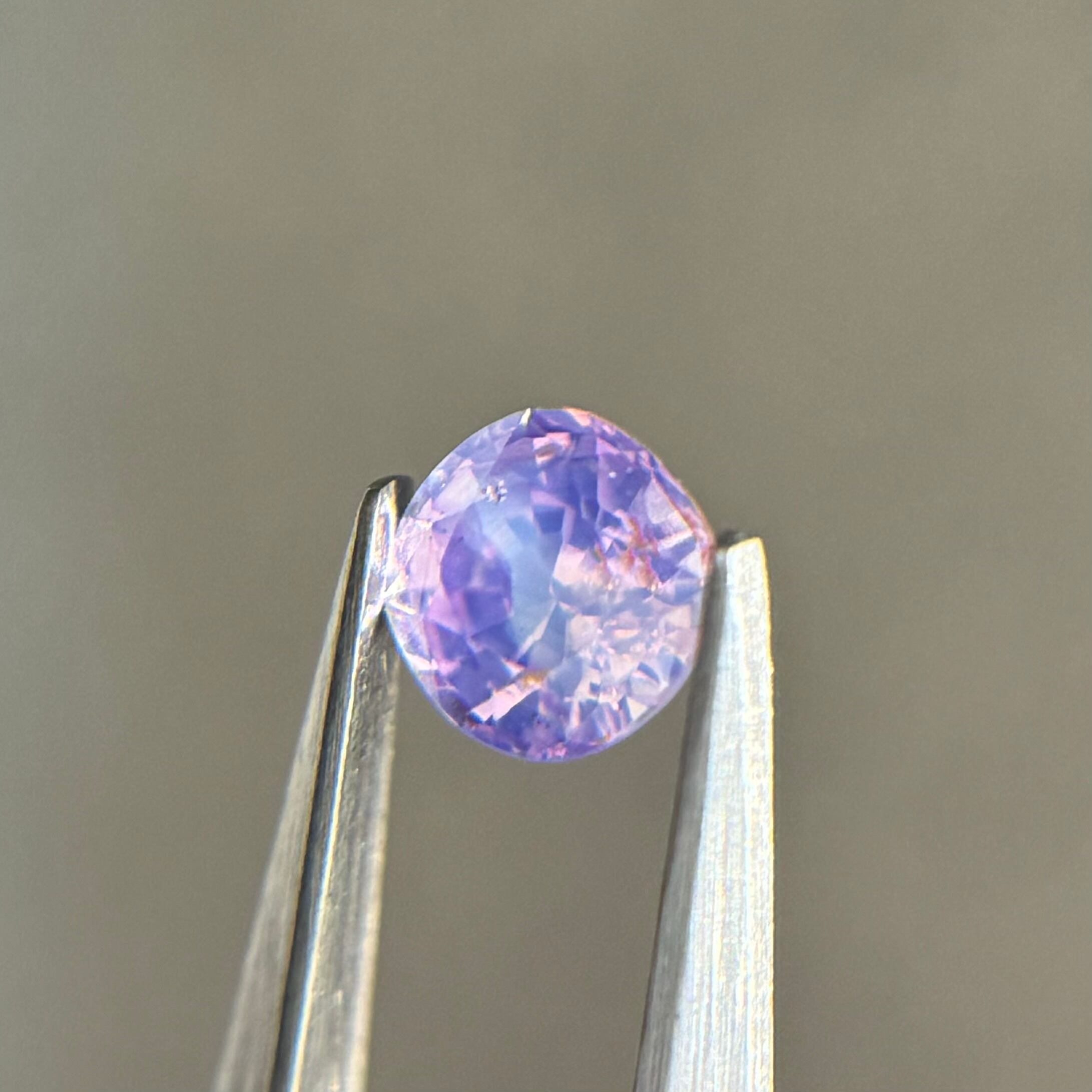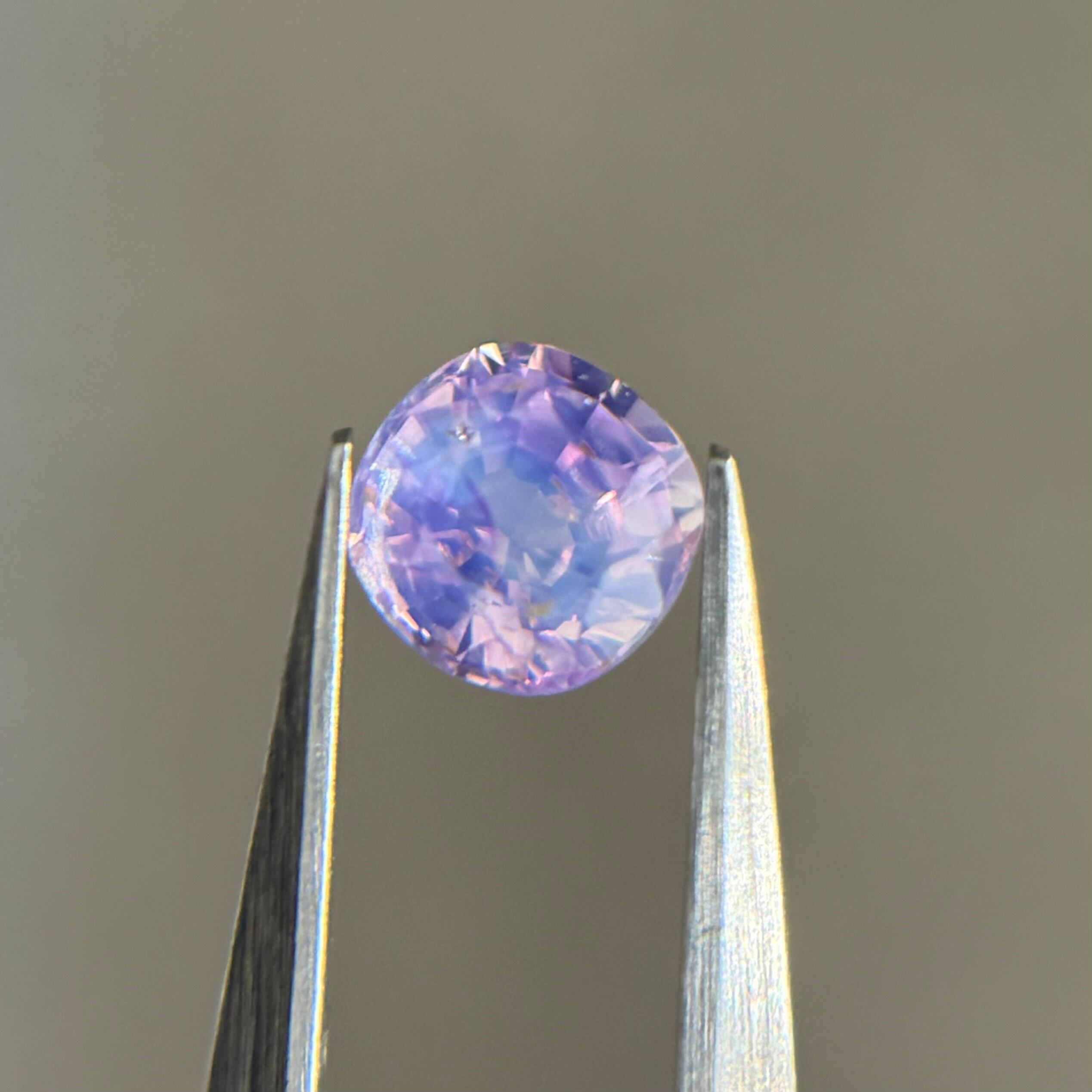 色だまりと複数色の照り、そしてクラウド状のインクルージョンがまるで水彩画で描いた星空のようなシルキーサファイアです。テーブルにある茶インクルージョンにテリが反射して、お星様のような黄色いテリに見えるのがまた一段と幻想的です