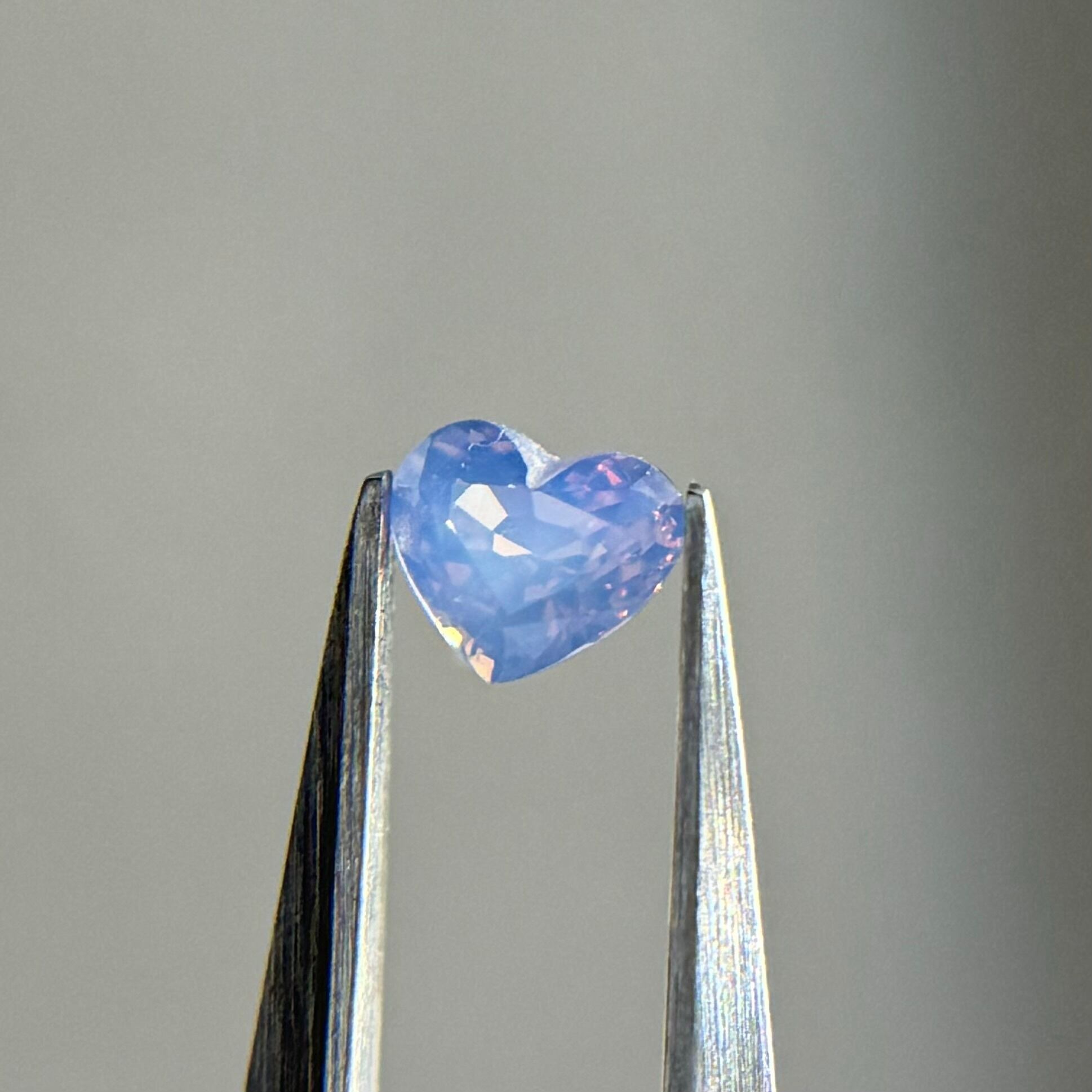 ミルキーブルーに淡いピンクと黄色のテリが可愛らしいシルキーサファイアです。テーブル側は目立ったキズもない美人さんです