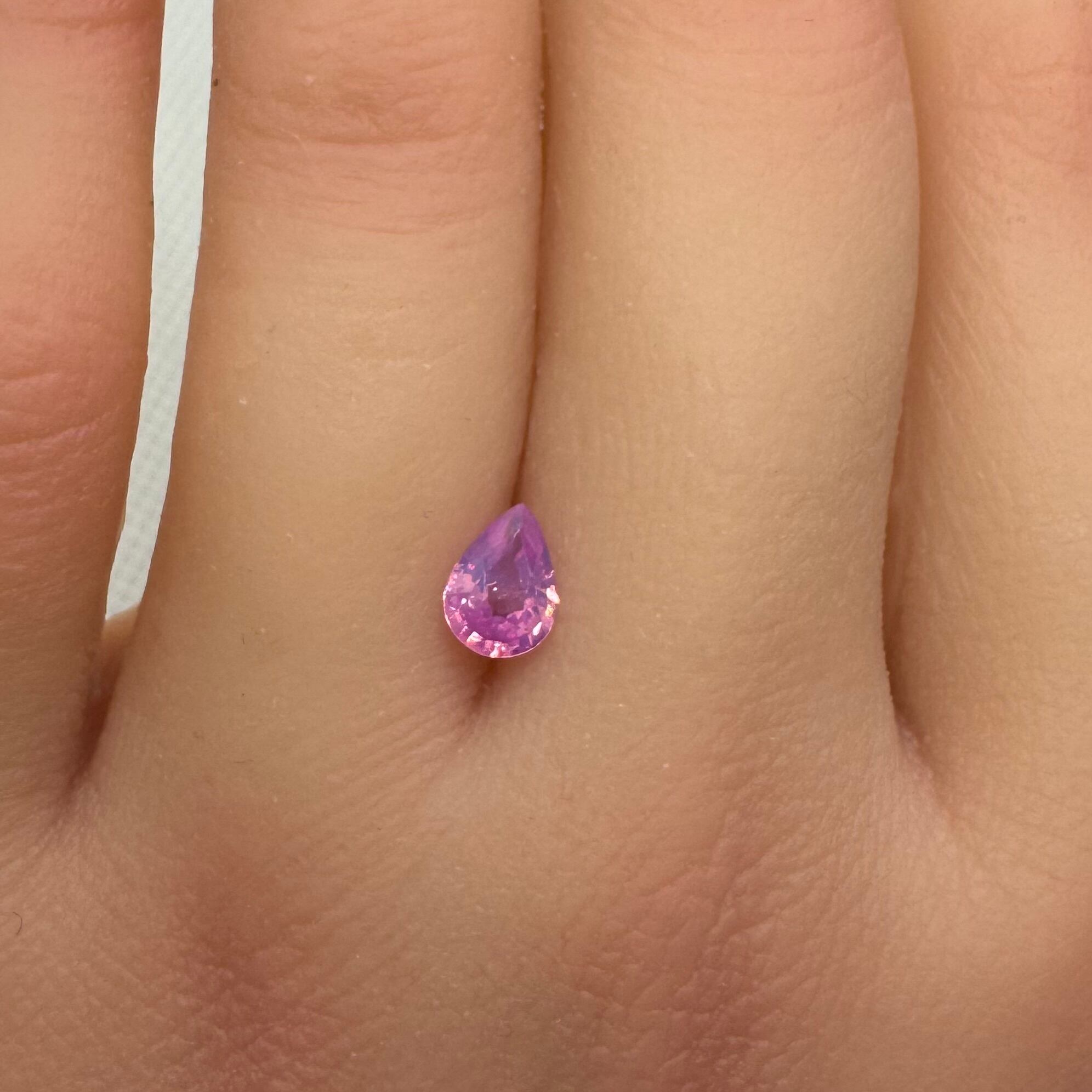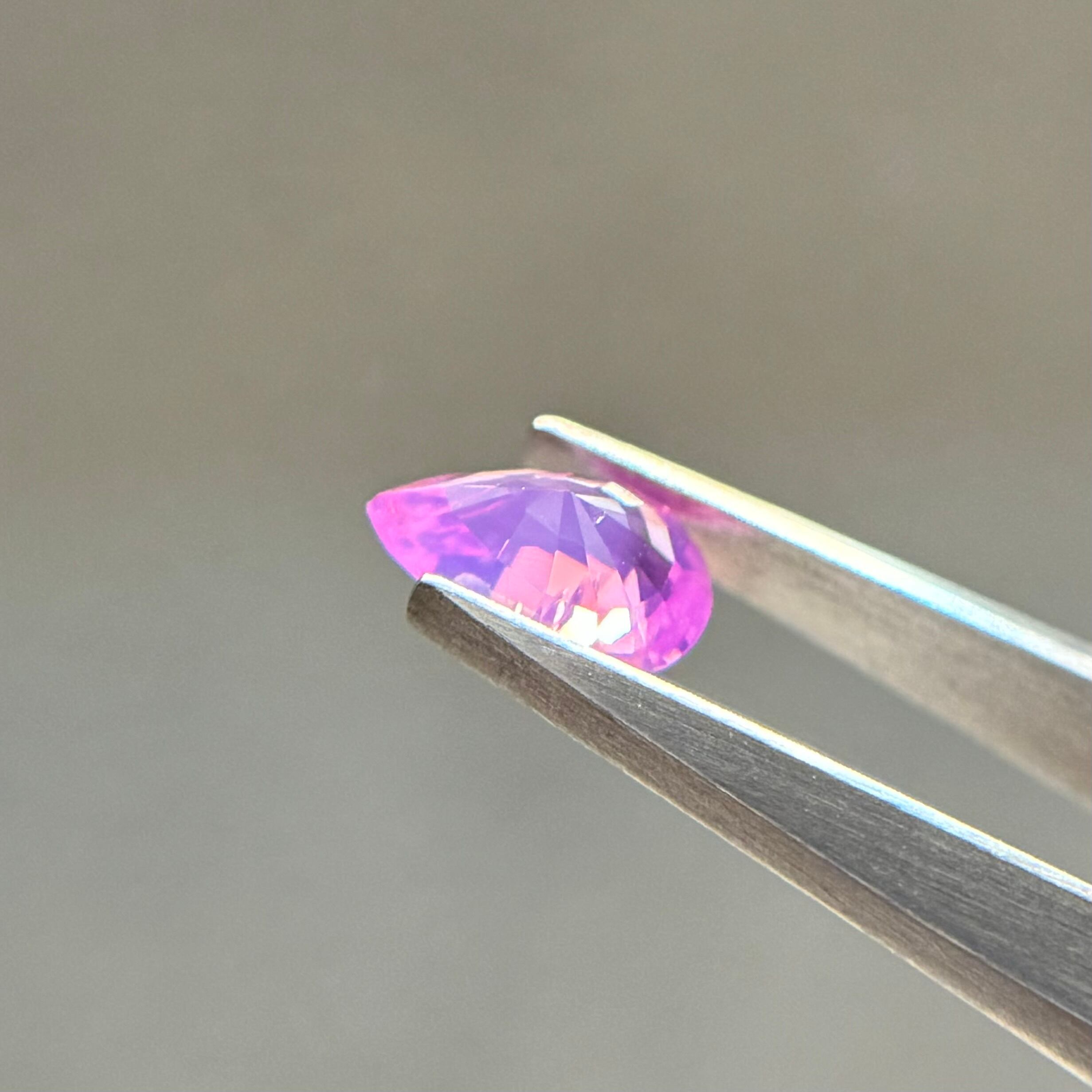 とにかくキラッキラなシルキーサファイアです。上側が濃いピンクのテリ、真ん中に光の加減で紫色を挟んで下側に薄いピンクのテリがたまります。幼い頃に夢見た魔法少女のコンパクトなどに使われていそうな色合い&キラキラ度合いです