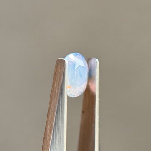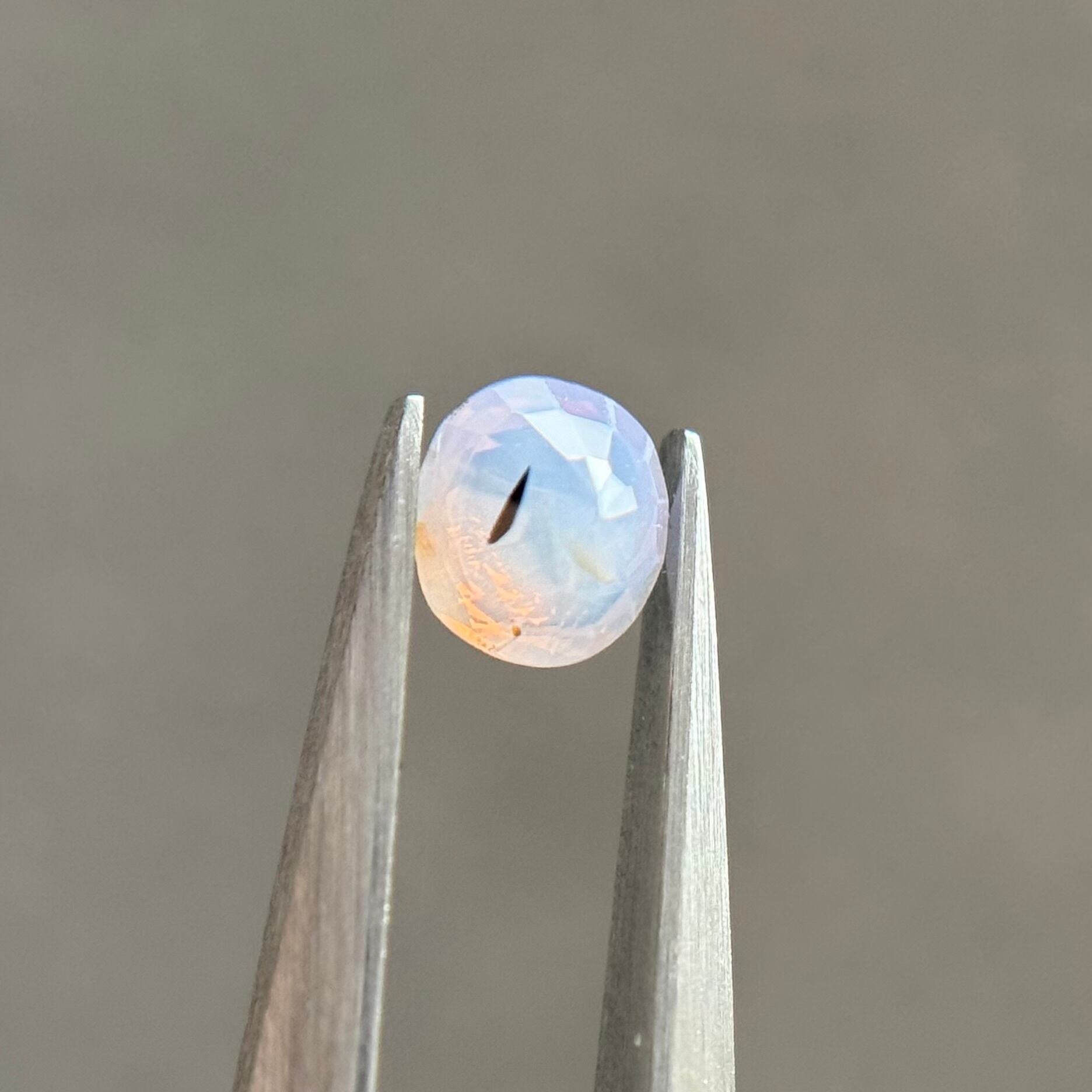 ミルキーな水色が可愛らしいシルキーサファイアです。ピンクとオレンジのテリがメラメラと炎のようにゆらめいて美しいです
