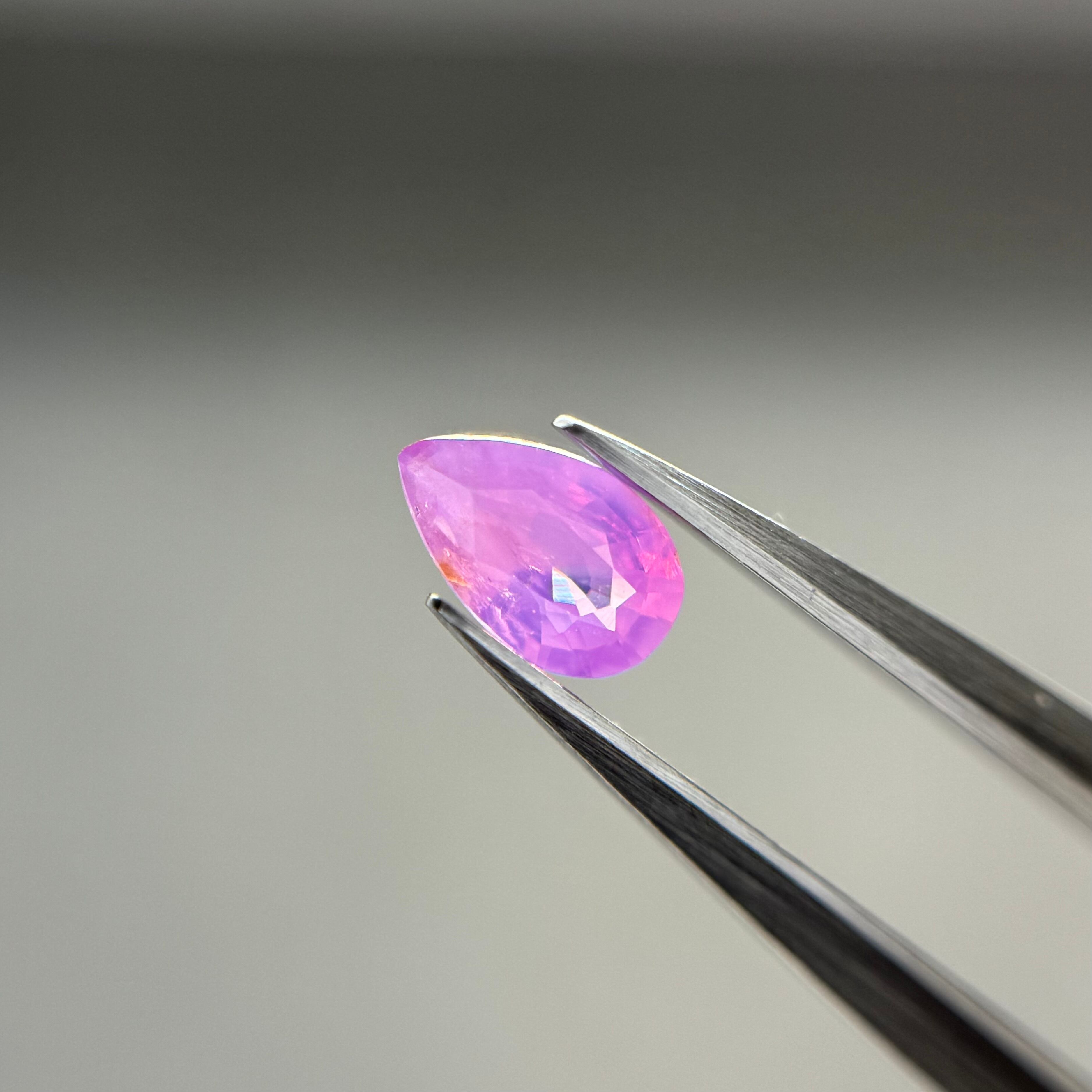 紫がかったピンクが可愛らしいシルキーサファイアです。先っぽ部分にかけて内部に大きめの結晶体インクルージョンがありますが、そこにテリが反射してキラキラするのがまた可愛いです