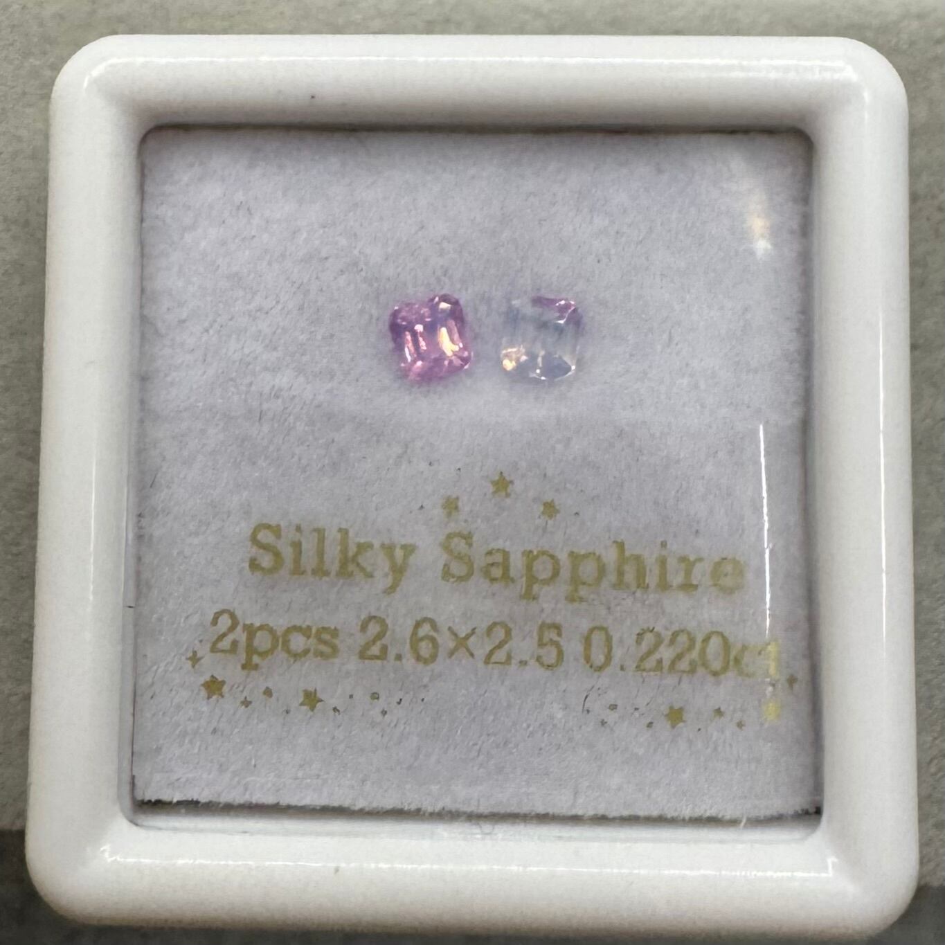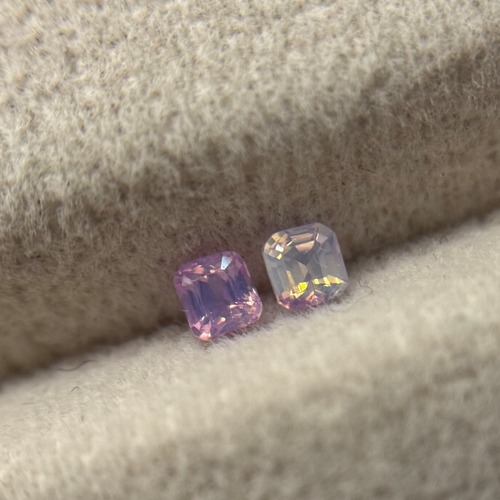 青っぽピンクと青っぽ白が可愛いエメラルドカットのシルキーサファイアセットです。青っぽ白ちゃんのピンクの色だまりがチャームポイントです