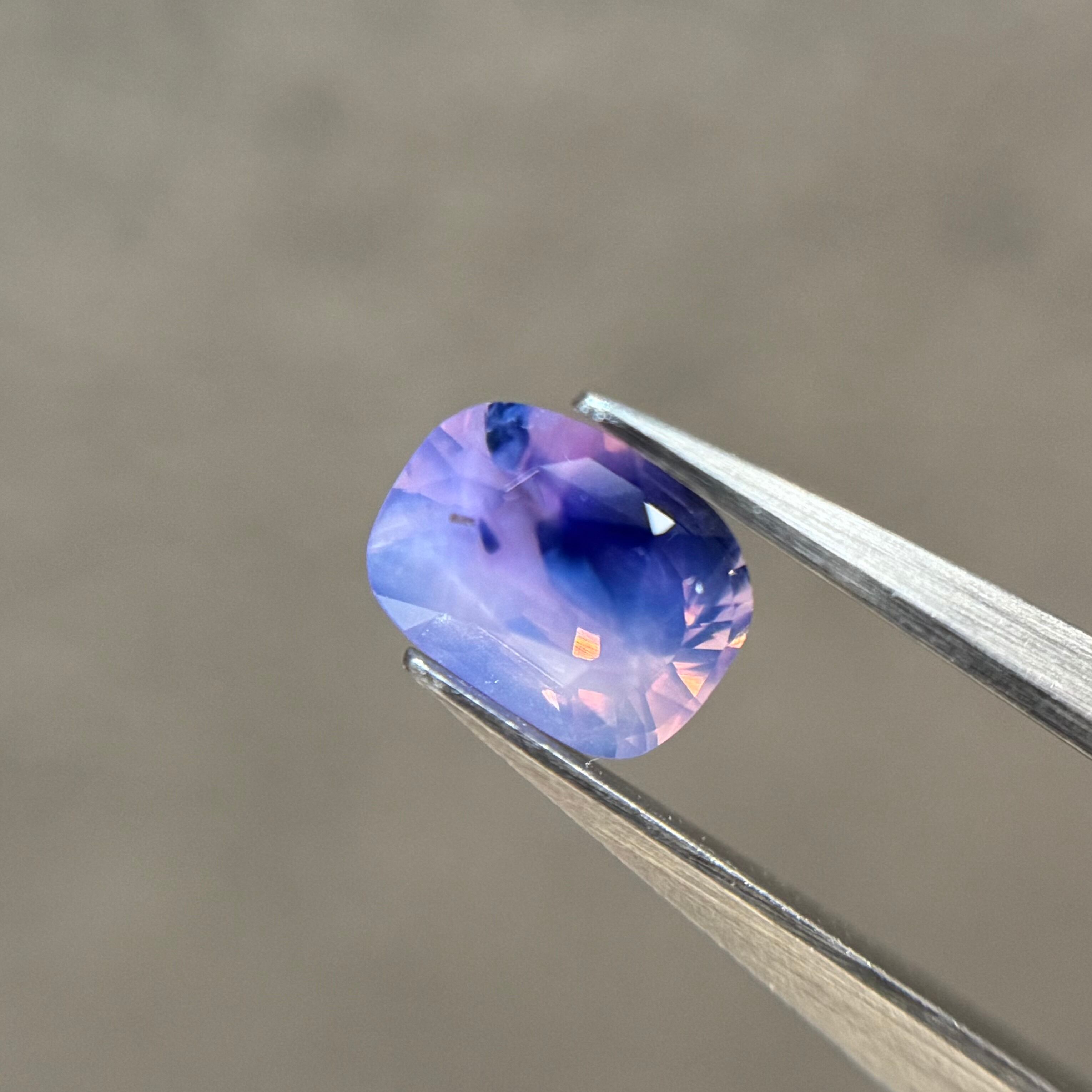ミルキーブルーからミルキーピンクへとグラデーションになっているベースに、複数色のテリと青だまりが複雑に混ざり合い、まるで朝焼けのようなシルキーサファイアです。とにかく美しいです