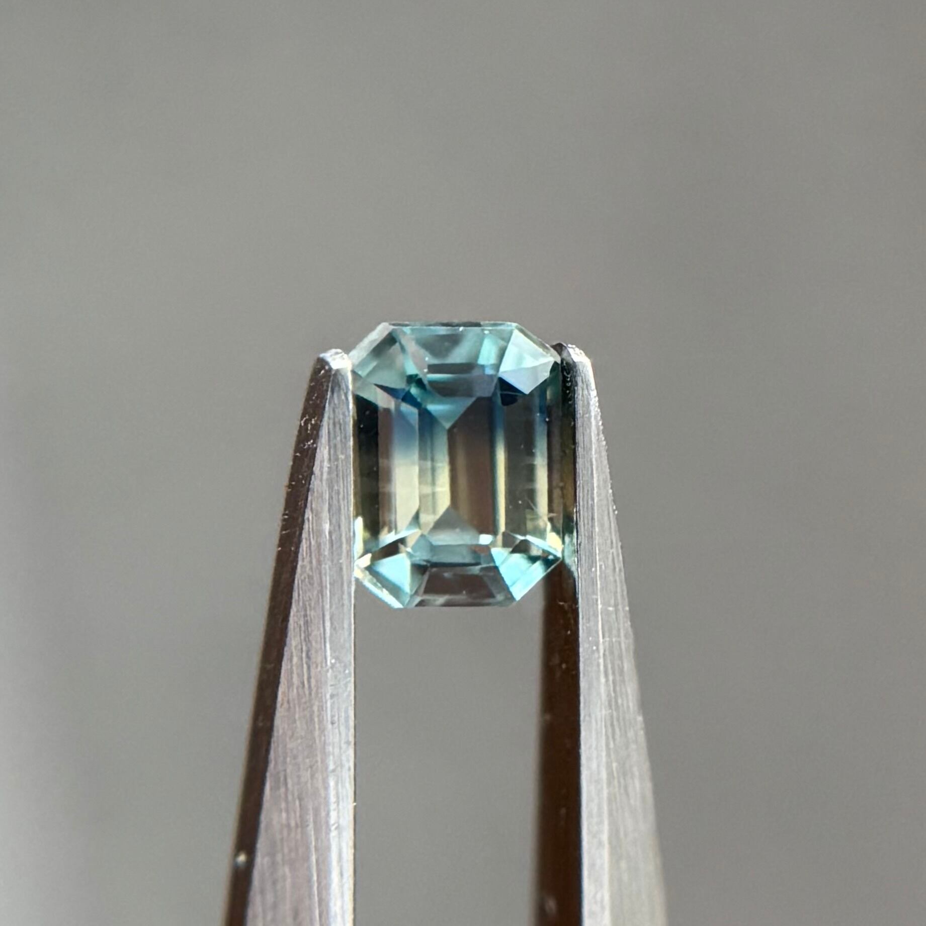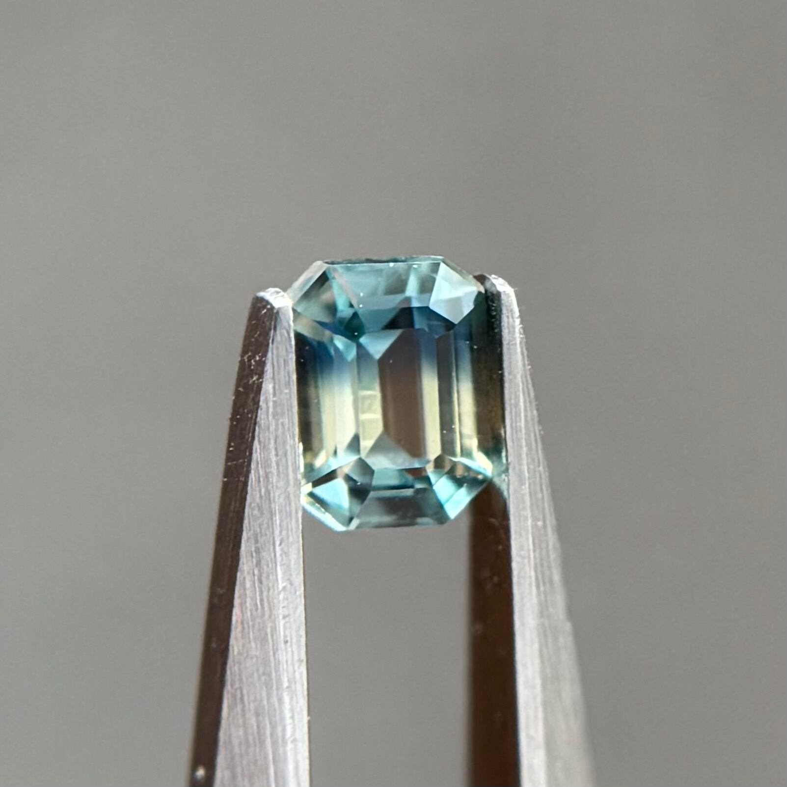 イエローがかった黄緑と青緑のバイカラーが美しいサファイアです。ネオン感と煌めきがしっかりと感じられます。横にするとバイカラーがくっきりと、縦にするとグラデーションと、向きによって色合いが変化します