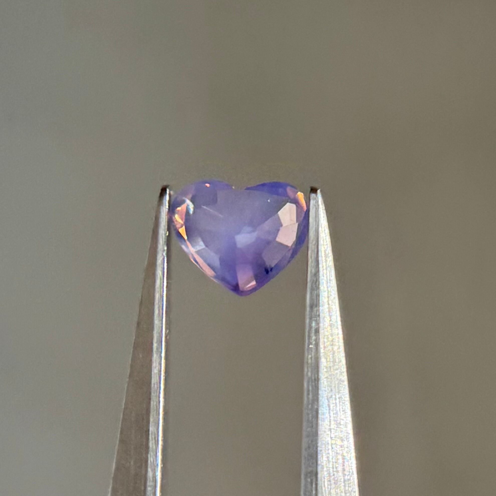 まるで夜明け前のような色合いのシルキーサファイアです。紫にかかるクラウド状のインクルージョンがまるで雲のようで、その中から煌めく複数色のテリが複雑な色合いを作り出します。テリの出方が不思議で、横に傾けるとハートの半分がテリで覆われます