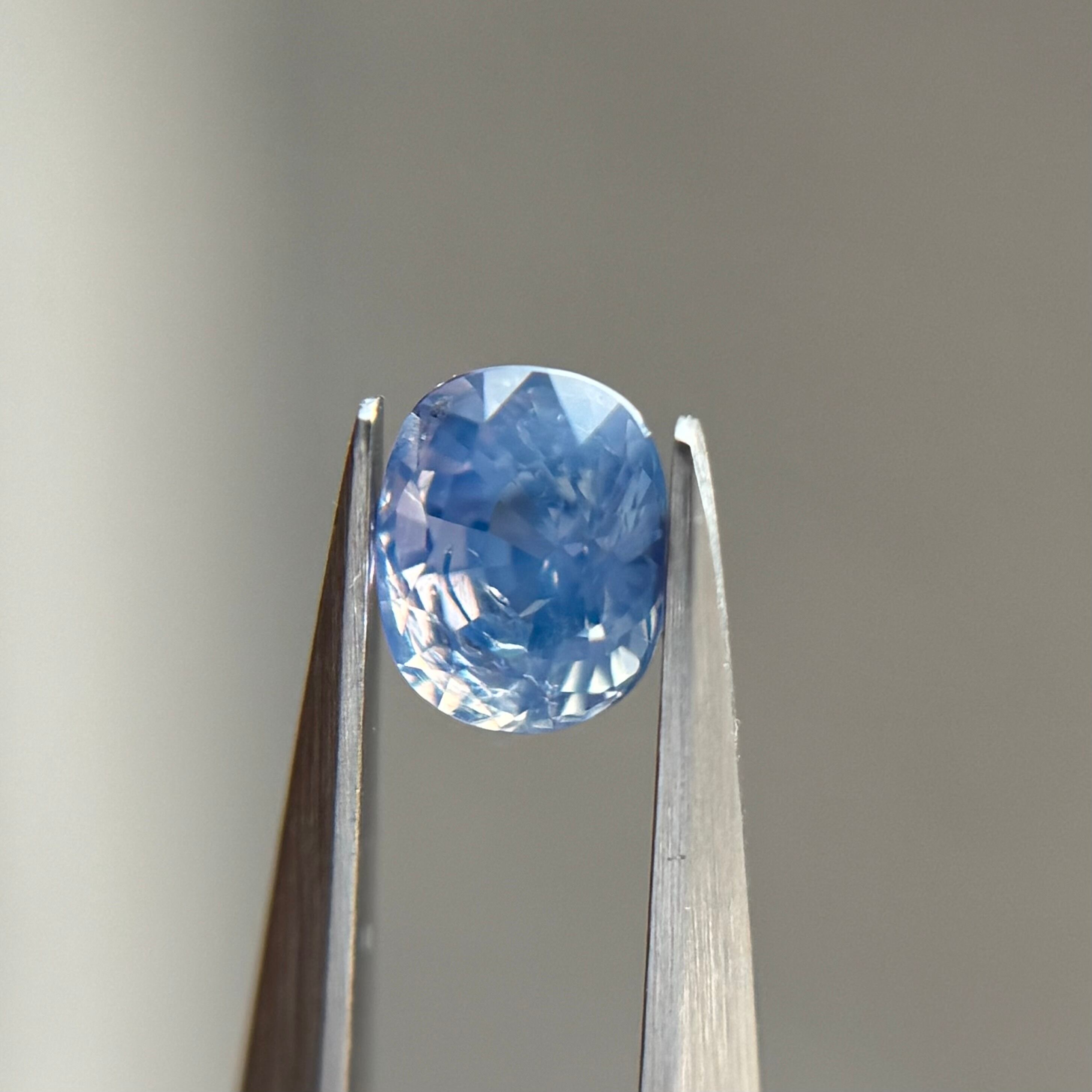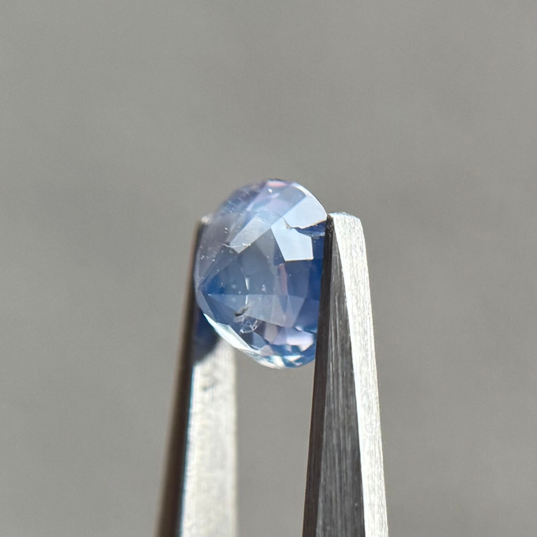 角度によって複数の色が楽しめるニュアンスカラーが美しい珍しいお色味のシルキーサファイアです。角度によってはほんのり緑色っぽいテリも顔を出します。パビリオン側の生地足らずはテーブル面からは気になりません